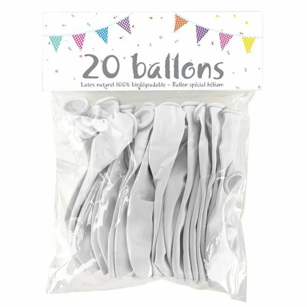 Ballons en latex blanc, d’un diamètre de 25 cm. 100% latex biodégradable. Sachet de 20 ballons.