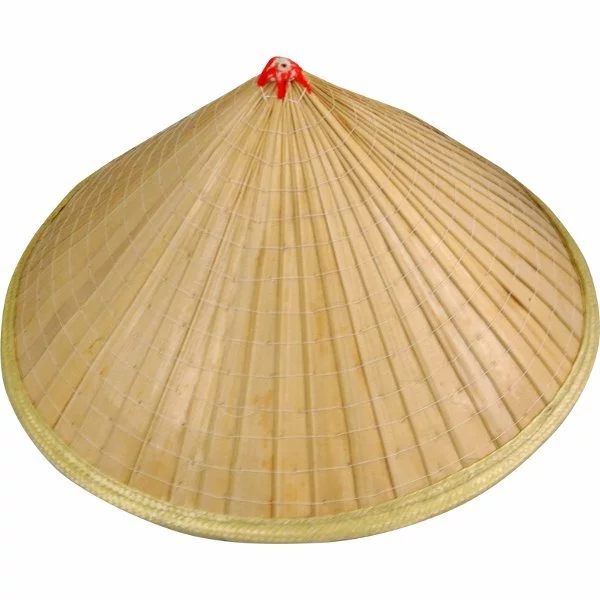 Chapeau asiatique en bambou avec cordon de serrage, d’un diamètre de 44 cm et d’une hauteur de 25 cm environ.