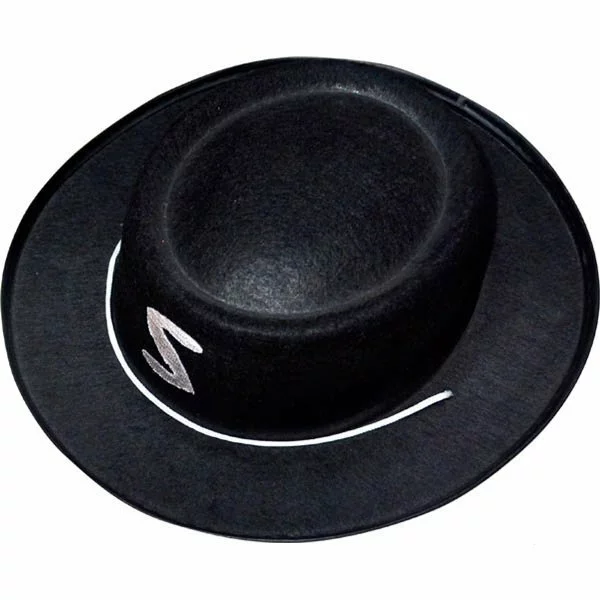 Ce chapeau justicier enfant est en feutrine noire avec un Z floqué sur le devant et un ruban faisant le tour du devant du chapeau pour le fixer sous le menton.