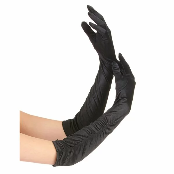 Gants plissés longs noir, effet satiné, d’une hauteur de 43 cm.