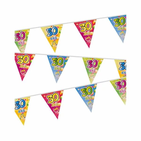 Guirlande 30 ans, 20 fanions plastifiés imprimés recto-verso, d’une longueur de 7 mètres. Chaque fanion mesure 22×26 cm.
