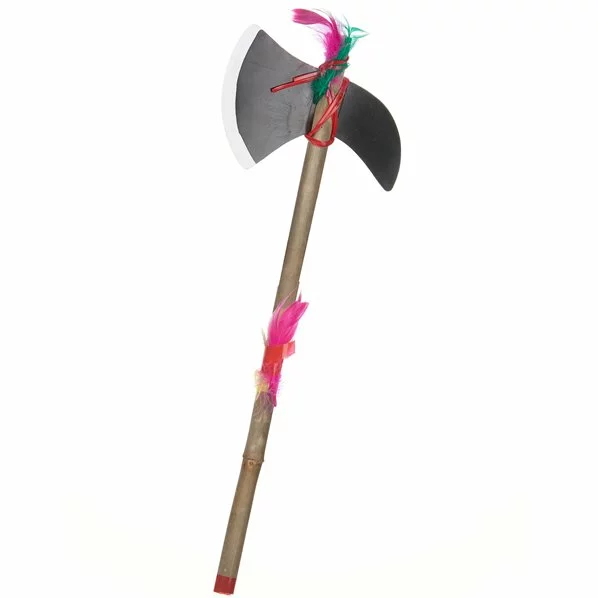 Ce Tomahawk est en plastique avec des plumes, d’une hauteur de 36 cm environ.