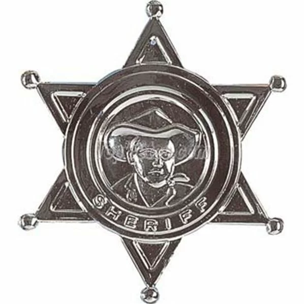 Etoile de Sheriff en plastique, diamètre 7,5 cm environ, avec épingle pour fixation sur le vêtement.